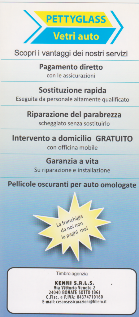 La nostra agenzia si avale di PETTYGLASS Vetri auto per sostituzione e riparazione vetri auto.